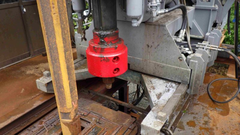 写真はボーリングマシンとロッド(掘削棒)の段取り風景です。 今回は、トリコンビットと言われるダイヤモンドの刃先が付いたもので掘削を行う、ロータリー工法を採用。 そこにロッド(掘削棒)と呼ばれる管(6.0m)を接続して 掘削を進めていきます。 掘削スピードは、地層によって異なり、固い岩盤の地層では 1日で数メートルしか進まない場合もあります。 また、ビットが岩盤に噛んでしまい、ボーリングマシンが 動かなったり、最悪の場合には、先端部が地中深くで 破損するような事態にも・・・ あらゆる事態にも冷静に、安全に、確実に進めるために 地層データ、過去の経験値等、様々なことを勘案して 作業に当たります。