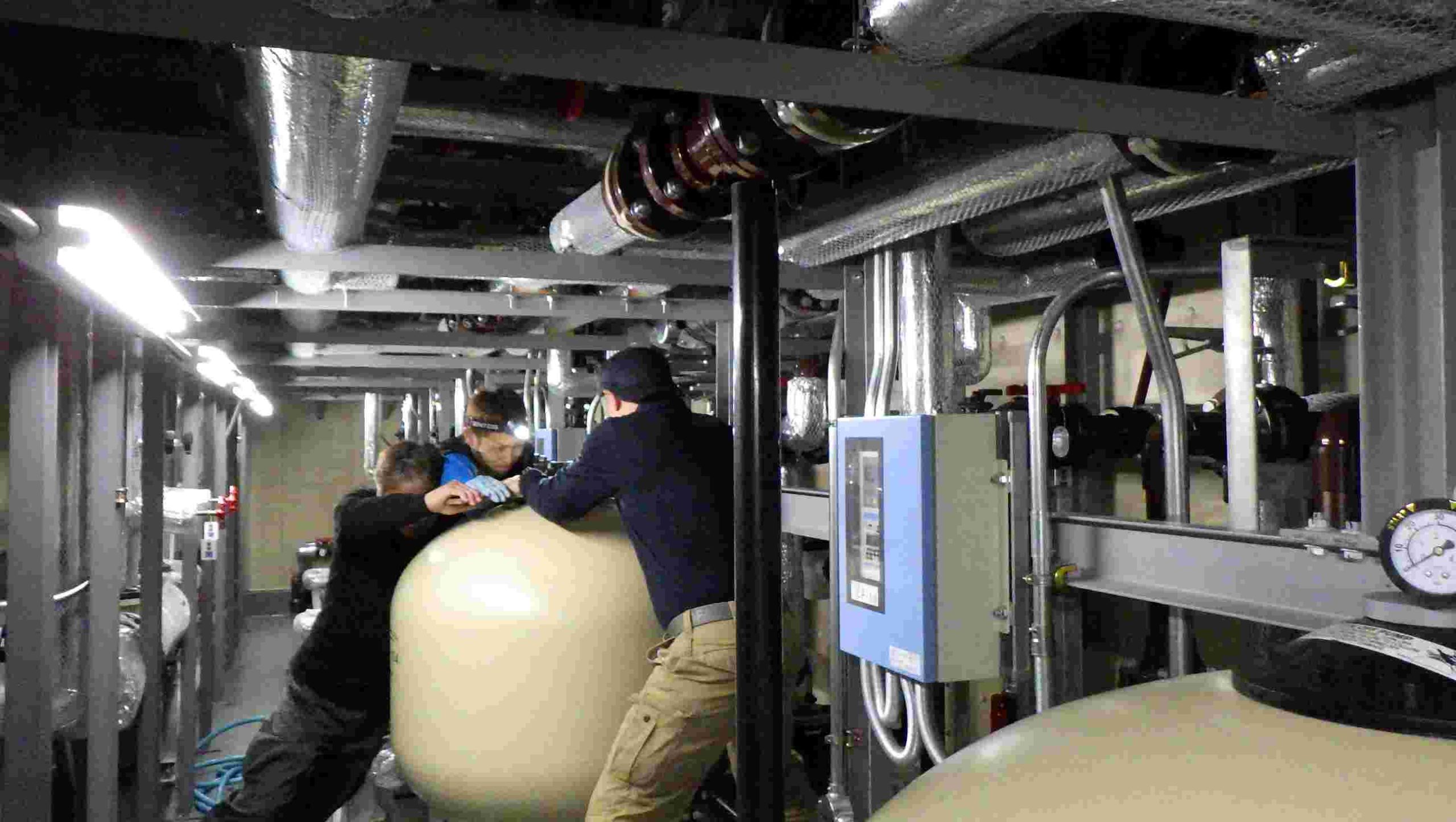 この写真は、ろ過器内部のろ過材の交換作業です。弊社は新規の温泉コンサルティングから具体的な 温泉設備の設計・施工・メンテナンスまで一元化してサービスを提供する温泉専門会社です。 温泉のことでしたら、何なりとお申し付けください。