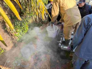 本日も引き続き、老舗有名温泉ホテルさんの 温泉井戸改修工事です。無事に既存のエア管・揚湯管を 引き揚げ、新規エア管・揚湯管を設置しました。 再度にコンプレッサーを稼働させ、濁りと 揚湯試験を実施いたしました。 温度も改修 […]